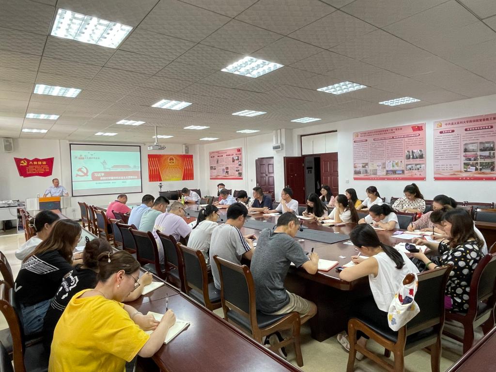 7月14日下午,学校党委委员、副校长龚其海在药学楼1-506会议室以《聚焦十九届六中全会——习近平新时代中国特色社会主义思想概论》为题讲授专题党课。药学院党委班子、各党支部书记及支部委员参加了党课。