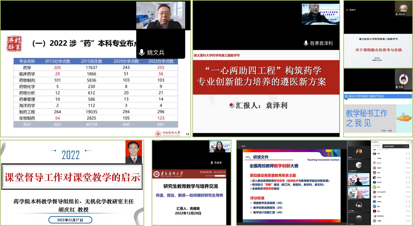 特邀嘉宾姚文兵教授以“建设一流药学学科和一流药学专业的思考”为题作了主旨报告,报告分析了我国药学学科和药学类本科专业发展的现状、存在的问题,并分享了建设一流药学学科和一流药学专业的思考和方案。姚文兵教授的报告高屋建瓴、内涵丰富、对我校药学学科、专业建设、教学研究、人才培养等均具有十分重要的指导作用和意义。随后,胡庆红、袁泽利、高健美、鲁艳柳、姚秋丽和朱蕾分别就课堂督导、教学成果、研究生教育、教学创新、课程思政、教学秘书等内容进行了经验分享与交流。
