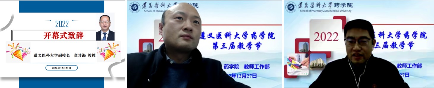 为做好一年教学工作总结与交流,促进教学方法改革,提升教学能力和教学效果,锻造一支师德高尚、业务精湛的高素质教师队伍。12月27日,药学院联合学校教师工作部举办第三届教学节暨学校教师成长发展互助平台活动。学校党委委员、副校长龚其海,中国药科大学副校长姚文兵,学校教师工作部部长杨清玉莅临指导,药学院党政领导、各部门负责人及药学院教师齐聚“云”端,本次活动由药学院党委书记袁泽利及副院长李利生主持。