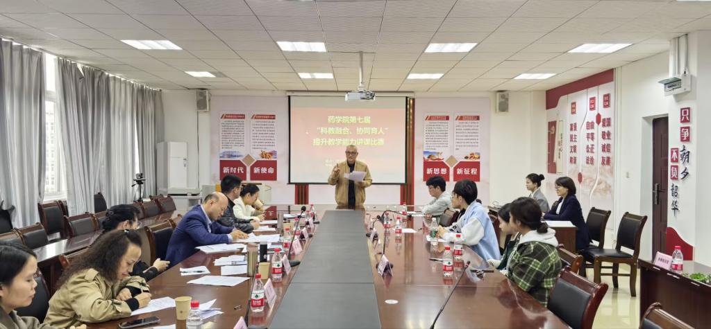 为持续做好学院青年教师教学能力提升,10月21日,药学院举办了第七届“科教融合·协同育人”提升青年教师教学能力讲课比赛。比赛邀请遵义医科大学本科教学督导团薛黔教授和杨映萍教授担任特邀评委,药学院党委书记袁泽利、党委副书记吴庆、副院长李利生以及学校首批未来教学名师鲁艳柳教授和姚秋丽教授担任比赛专家评委,还邀请了4名本科生担任学生评委。比赛由李利生主持。