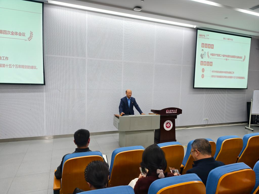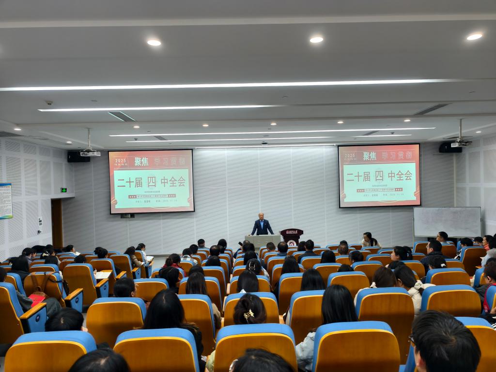 11月19日下午,学校党委常委、副校长,药学院党委书记袁泽利在新蒲校区图书馆三号报告厅,为药学院师生党员、副科级以上干部专题宣讲党的二十届四中全会精神与学校第二次党代会精神。
