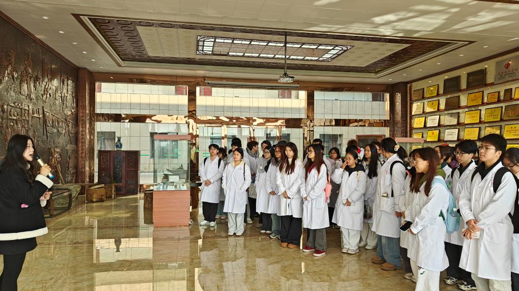 实践团队首先探访企业内部的药材仓库、现代化生产车间与研发实验室。仓库中,同学们通过辨形、观色、闻味,直观感受道地药材的品质特征;生产线上,亲眼见证古老方剂如何经标准化、智能化流程转化为优质中成药;实验室里,近距离接触中药研发前沿技术,切身感悟“丸散虽微其责重若泰山,传承虽艰其志可通星汉”的匠心与担当。