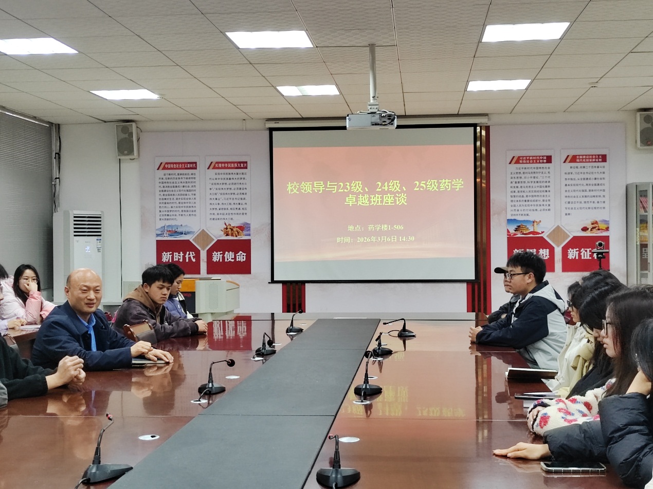 3月6日下午2点30分,学校党委常委、副校长袁泽利在药学楼1-506会议室,为23级、24级、25级药学卓越开新学期班会。