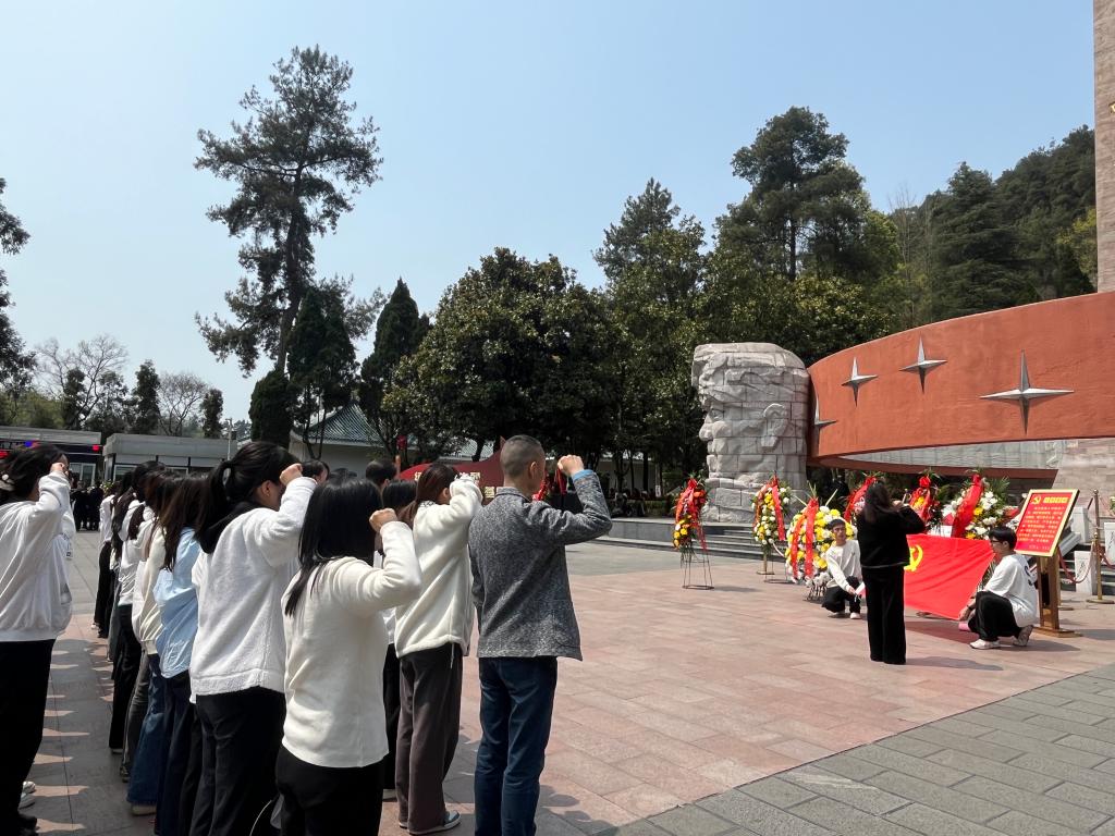 在红军山烈士陵园,全体师生在烈士纪念碑前肃立默哀,并向革命烈士敬献花篮,教师代表整理绶带,表达对先烈的崇高敬意。吴庆副书记领誓,重温入党誓词,杜艺玫带领全体团员重温入团誓词。随后, 全体师生从红军山出发,徒步前往遵义医科大学大连路校区,在陈荣殿、伍律先贤墓碑前开展祭扫活动,师生向陈荣殿、伍律两位先贤墓碑默哀致敬,吴庆副书记详细介绍了两位先贤的生平事迹和伟大贡献。之后由学生代表献花篮,教师代表整理绶带,各师生依次献白花,同学们将自己折的白花献于墓碑前,致以崇高敬意,深切缅怀他们为药学教育事业作出的卓越贡献。