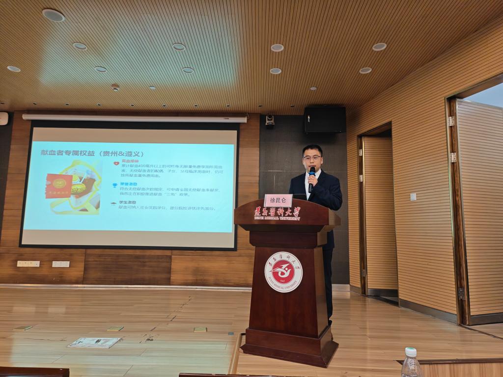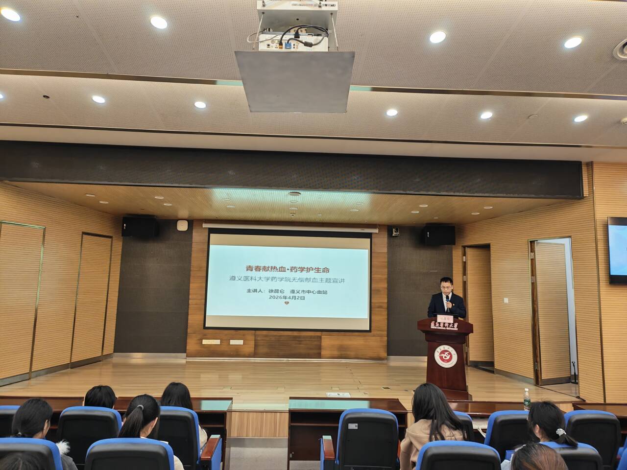 4 月 2 日晚,新蒲校区图书馆 1 号报告厅,药学院如期开展主题为 “青春献热血 药学护生命” 的无偿献血宣讲活动。本次活动由药学院团委统筹安排、药学院青年志愿者协会精心组织筹备,特邀遵义市中心血站血液质量管理科徐昆仑主讲,学院团委副书记杜艺玫、各年级学生参加,活动由杜艺玫主持。
