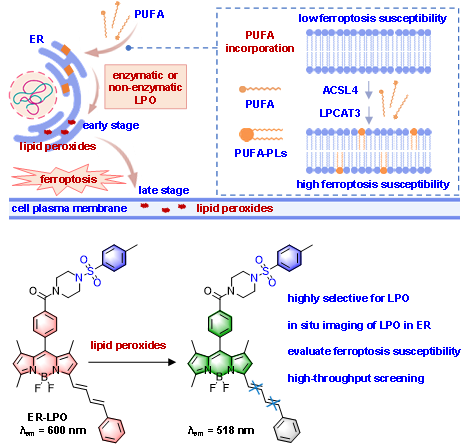 评估细胞对铁死亡的敏感性(由脂质过氧化LPO驱动的程序性细胞死亡过程),对于理解相关疾病发病机制及开发靶向治疗策略至关重要。为此,我校袁泽利教授课题组与中国科学院化学所马会民研究员课题组合作。依据内质网(ER)是铁死亡过程中LPO最早积累的位点,提出了通过监测ER中的LPO新策略。