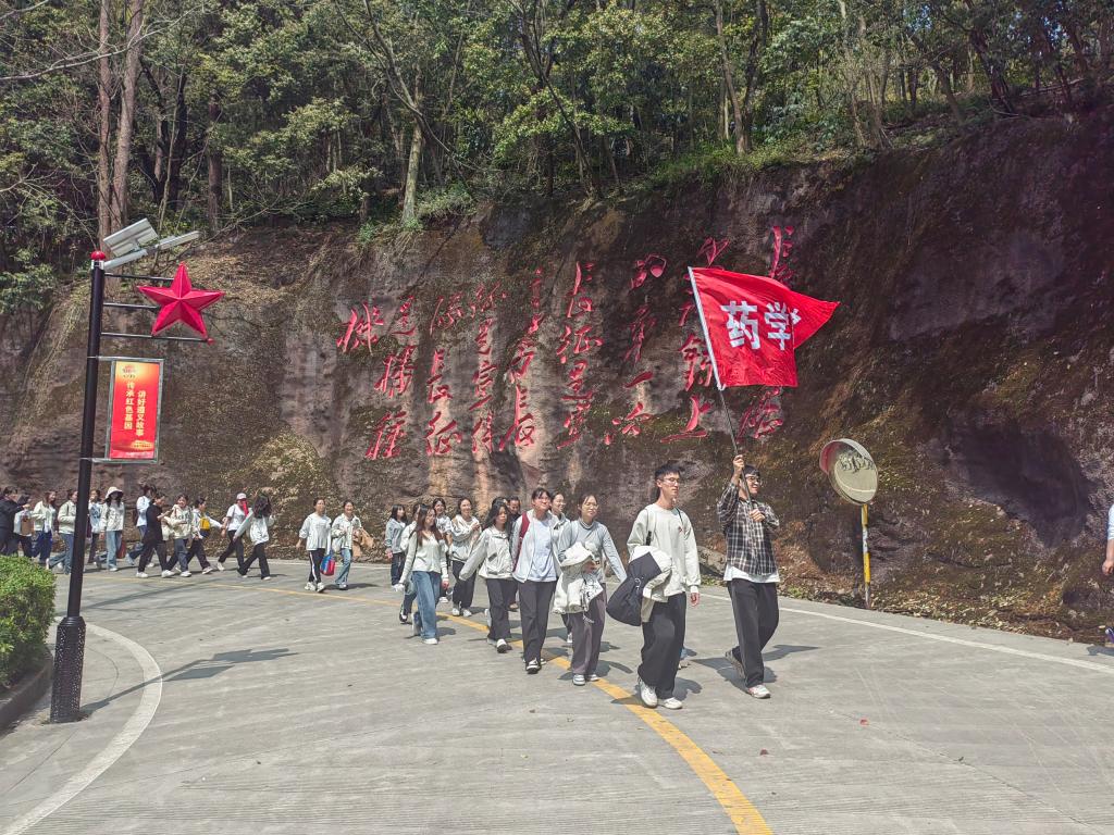 在红军山烈士陵园,全体师生在烈士纪念碑前肃立默哀,并向革命烈士敬献花篮,教师代表整理绶带,表达对先烈的崇高敬意。吴庆副书记领誓,重温入党誓词,杜艺玫带领全体团员重温入团誓词。随后, 全体师生从红军山出发,徒步前往遵义医科大学大连路校区,在陈荣殿、伍律先贤墓碑前开展祭扫活动,师生向陈荣殿、伍律两位先贤墓碑默哀致敬,吴庆副书记详细介绍了两位先贤的生平事迹和伟大贡献。之后由学生代表献花篮,教师代表整理绶带,各师生依次献白花,同学们将自己折的白花献于墓碑前,致以崇高敬意,深切缅怀他们为药学教育事业作出的卓越贡献。