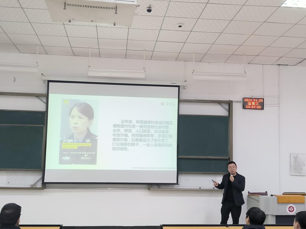 在本次活动中,保卫处徐远航老师作为主讲人向学生深刻剖析了电信诈骗,一边围绕“什么是电信网络诈骗”、“如何防范电信网络诈骗”等问题进行细致讲解。同时,结合所办理的实际案例,向师生进行逐一介绍并向师生传授了“识诈、反诈、防诈”技能。最后,倡导学生积极向身边的朋友、家长进行相关宣传,扩大宣传覆盖面,共同筑牢防电信诈骗的安全线,不给犯罪分子可乘之机。