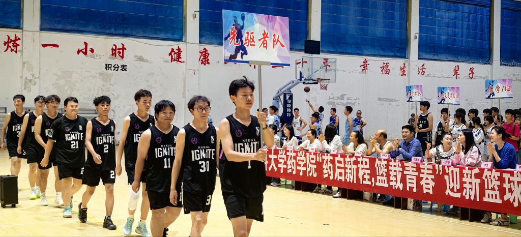 首场比赛由药学院教工队与2025级药学专业男队展开激烈对决,球员们敏捷的传球、精准的投篮、严密的防守,让现场欢呼声、呐喊声此起彼伏。