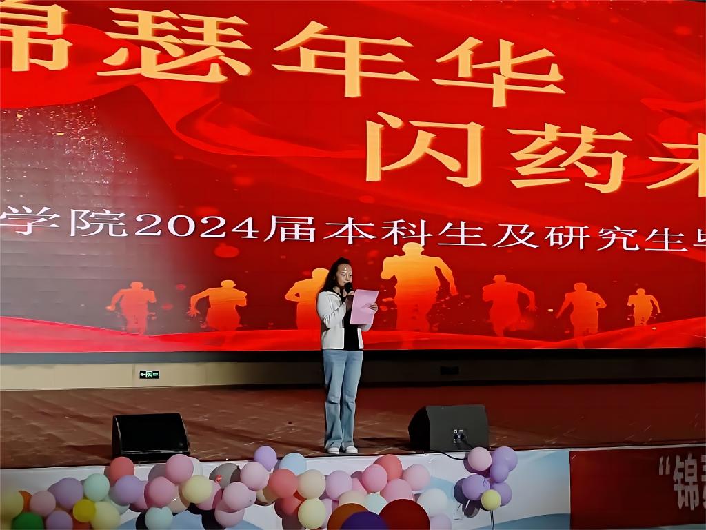 5月15日晚19:00,药学院在学校会堂开展2024届“锦瑟年华,闪药未来”本科生及研究生毕业晚会。学生工作部(处)部长杨艳,校团委书记余春玲,学校资助中心主任陈仁建,研究生工作部副部长张必丽,药学院党政班子和师生参加。