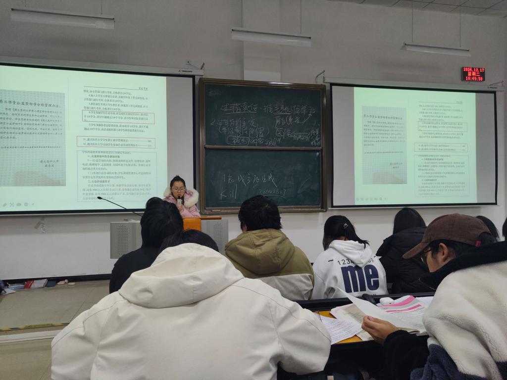 为增进学院2024级新生的诚信意识、自律意识,加深对学校的考试规章制度的理解,12月17日,药学院学生第二党支部书记刘玉楠在新蒲校区第三教学楼第二十阶梯教室,召开了新生诚信主题教育班会。
