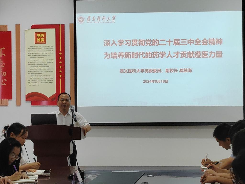 龚其海以《深入学习贯彻党的二十届三中全会精神,为培养新时代的药学人才贡献遵医力量》为题,从深刻领会党的二十届三中全会精神和培养新时代药学人才两个方面进行党的二十届三中全会精神宣讲。宣讲旁征博引、视野开阔,既有理论深度,又有实践广度,对与会师生深刻理解党的二十届三中全会精神极具教育和启迪意义。他勉励师生,要深刻领悟党的二十届三中全会精神,把党的二十届三中全会精神与具体工作和学习相结合,共同推进药学院高质量发展,为培养新时代的药学人才贡献遵医力量。
